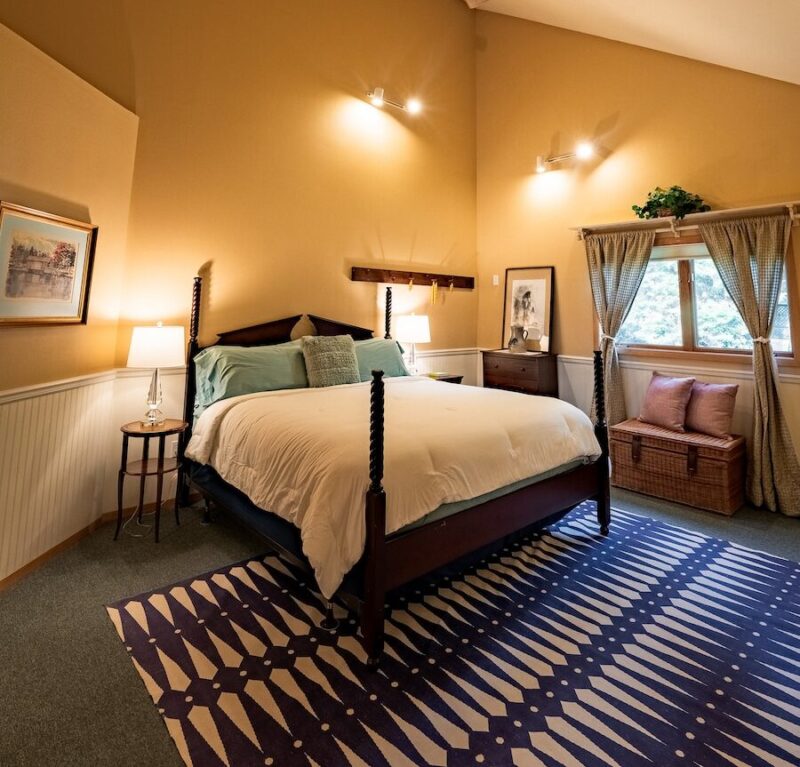 This light filled room features a queen-sized bed and spacious sitting area with a new modern line sofa and desk. Skylights give this room a lovely bonus for stargazers. Also, enjoy a first floor private deck with patio furniture and a beautiful south-facing wooded view.